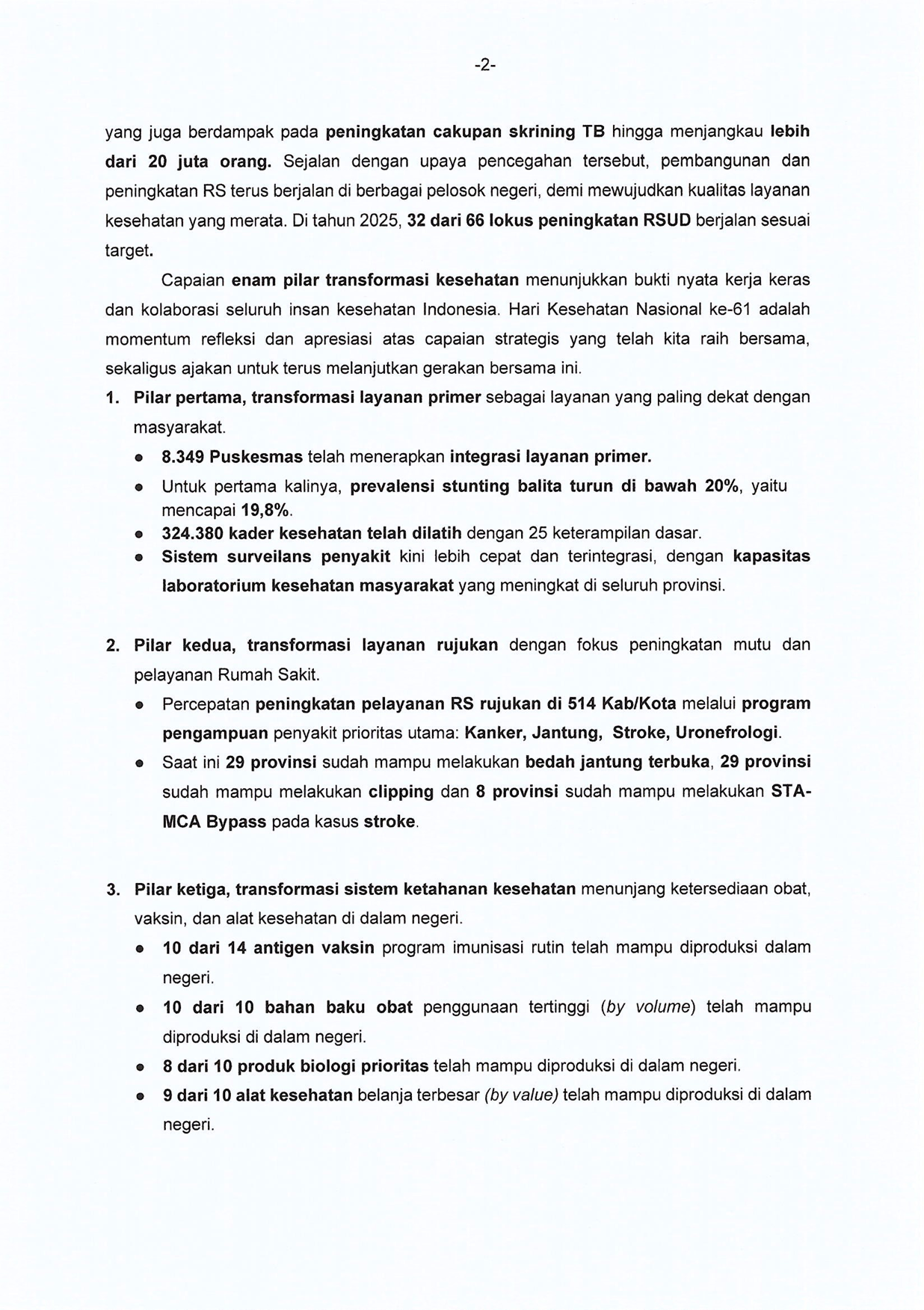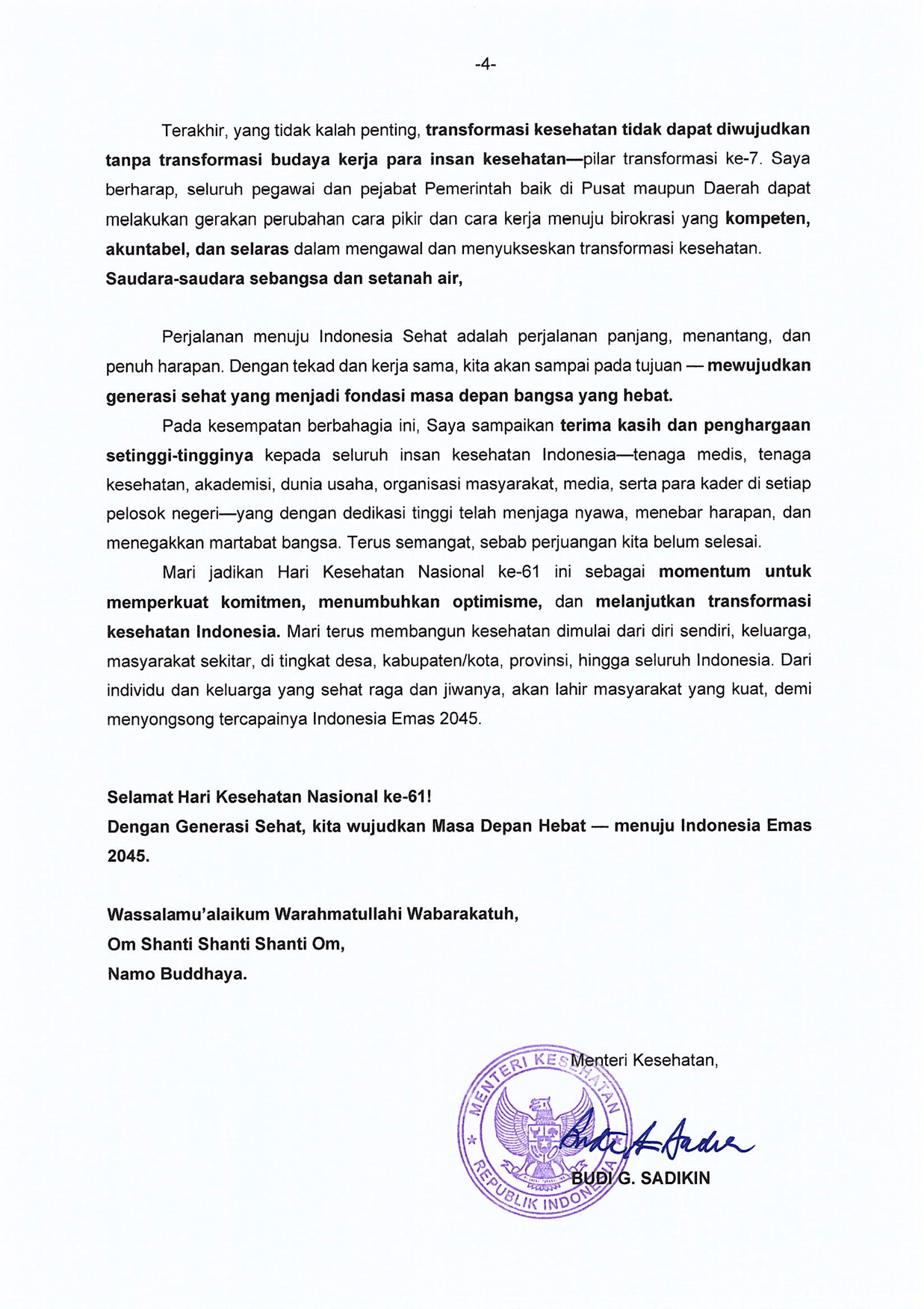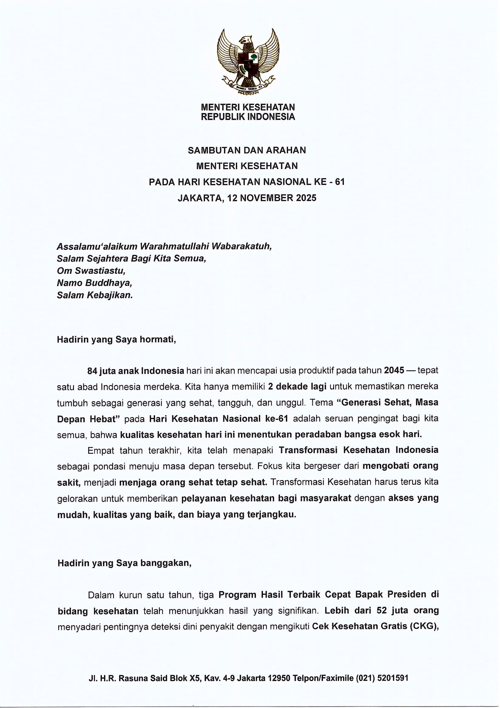 BERIKUT SURAT SAMBUTAN DAN ARAHAN MENTERI KESEHATAN REPUBLIK INDONESIA